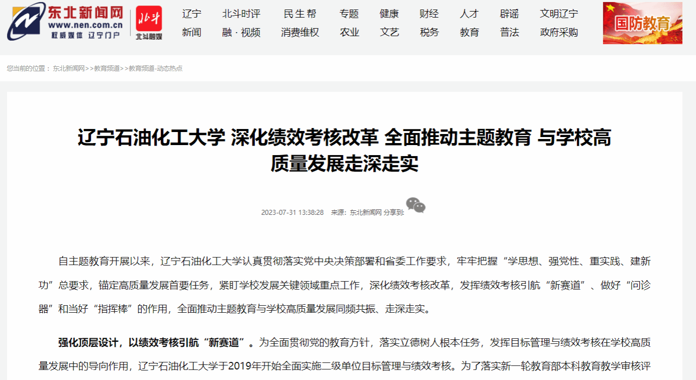 编者按:近日,东北新闻网、辽宁日报·北国号对我校牢牢把握“学思想、强党性、重实践、建新功”总要求,锚定高质量发展首要任务,紧盯学校发展关键领域重点工作,深化绩效考核改革,发挥绩效考核引航“新赛道”、做好“问诊器”和当好“指挥棒”的作用,全面推动主题教育与学校高质量发展同频共振、走深走实进行了宣传报道。现将相关报道转载如下: