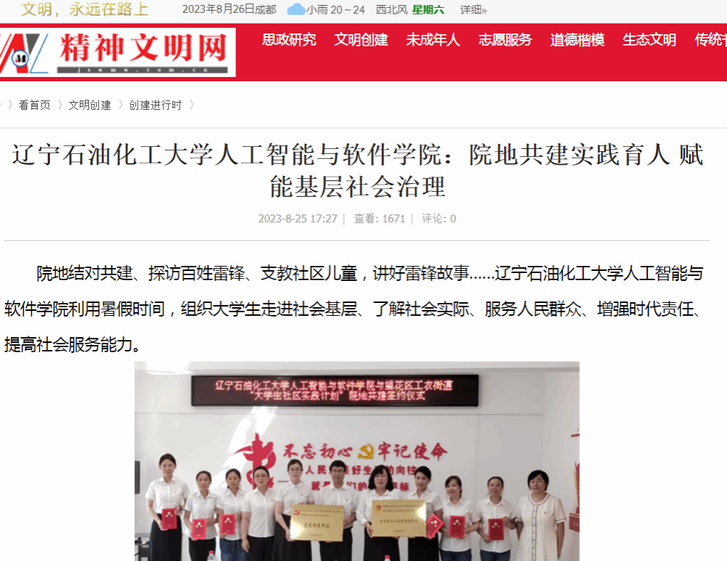 编者按:近日,精神文明网、辽宁日报·北国号、人民日报客户端·人民号等媒体平台对我校人工智能与软件学院利用暑假时间,组织大学生走进社会基层、了解社会实际、服务人民群众、增强时代责任、提高社会服务能力进行了宣传报道。现将相关报道转载如下:
