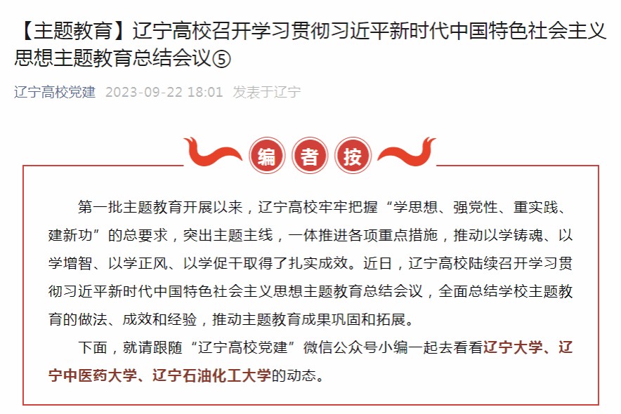 编者按:近日,辽宁高校党建微信公众号对辽宁高校陆续召开学习贯彻习近平新时代中国特色社会主义思想主题教育总结会议,全面总结学校主题教育的做法、成效和经验,推动主题教育成果巩固和拓展进行了宣传,其中对我校召开学习贯彻习近平新时代中国特色社会主义思想主题教育工作总结大会,全面梳理主题教育开展情况,提炼总结经验做法,巩固深化主题教育成果,在新起点上奋力开创学校事业发展新局面作了报道。现将相关报道转载如下: