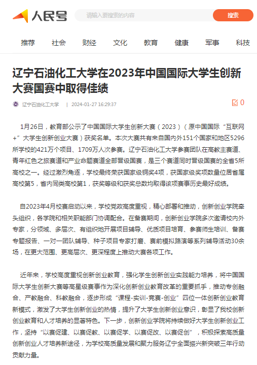 编者按:1月26日,教育部公示了中国国际大学生创新大赛(2023)(原中国国际“互联网+”大学生创新创业大赛)获奖名单。本次大赛共有来自国内外151个国家和地区5296所学校的421万个项目、1709万人次参赛。我校参赛团队在高教主赛道、青年红色之旅赛道和产业命题赛道全部晋级国赛,是三个赛道同时晋级国赛的全省5所高校之一。经过激烈角逐,学校最终荣获国家级铜奖4项,获国家级奖项数量位居省属高校第5,省内同类高校第1,获奖等级和获奖总数均取得该项赛事历史最好成绩。辽宁日报·辽望号、人民日报客户端·人民号、中国大学生网对此进行了宣传报道。现将相关报道转载如下: