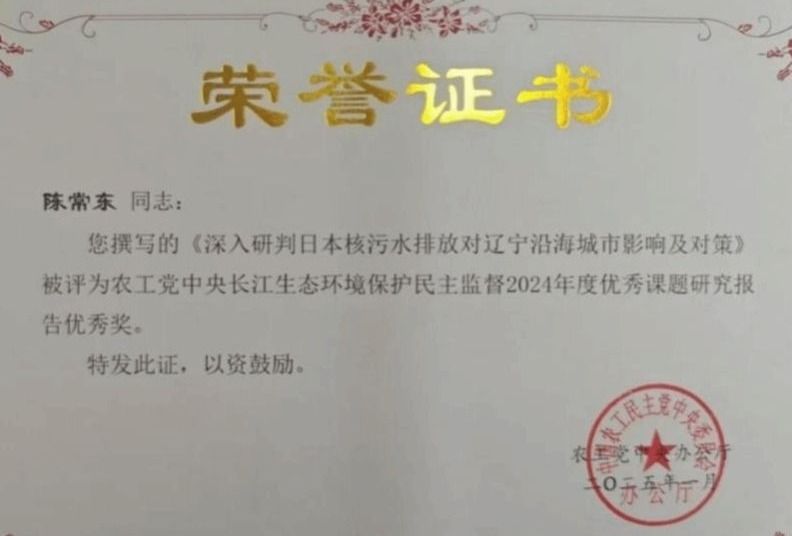 近日,中国农工民主党中央委员会公布了《关于农工党中央长江生态环境保护民主监督2024年度优秀课题研究报告的通报》及《关于2024年度优秀调研报告评选结果的通报》。我校农工党党员、抚顺市政协委员、石油化工学院陈常东副教授所撰写《深入研判日本核污水排放对辽宁沿海城市影响及对策》调研报告荣获“农工党中央长江生态环境保护民主监督2024年度优秀课题研究报告”优秀奖。